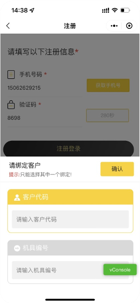 用户注册时还需绑定客户代码或机具编号;*客户代码、机具编号只能选择其中一个绑定